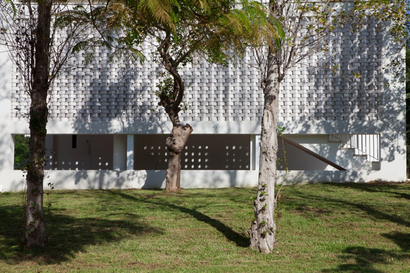 simple in its overall form, the rectangular design incorporates a mesh-like brickwork to its facade,