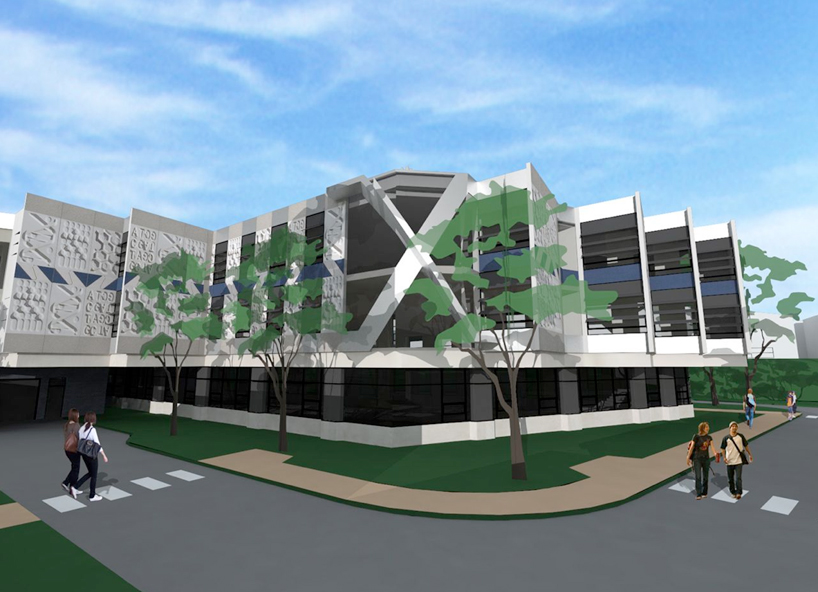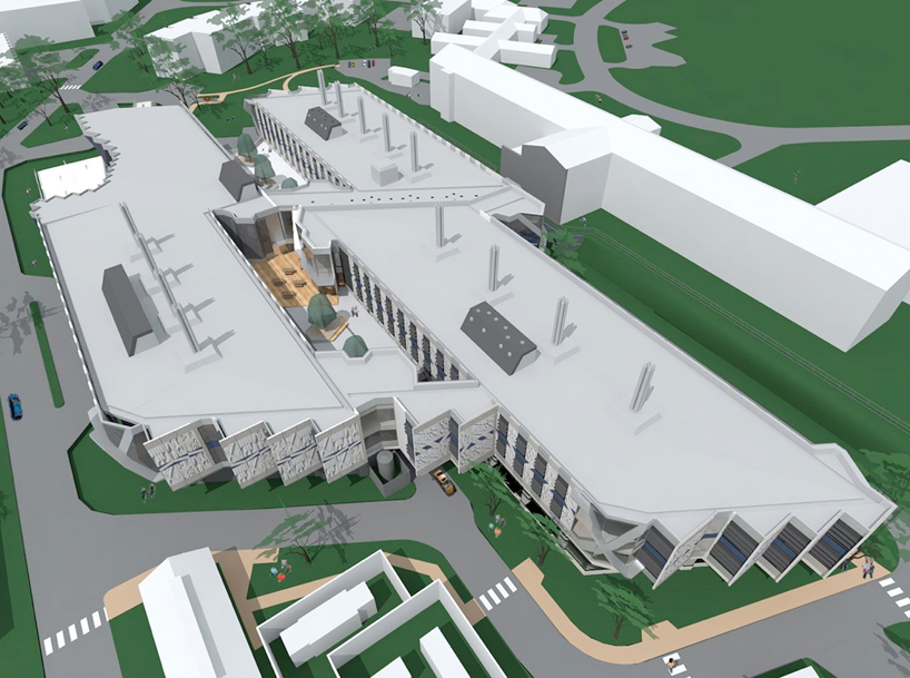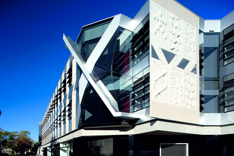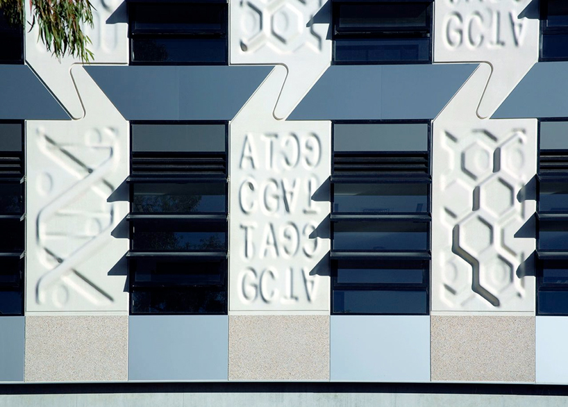 angular glass and steel fins expand outwards, giving the form a strong sense of movement and orientation. alternating panels gradually reveal the inner-workings of the school as the viewer approaches the entrance. digitally rendered concrete panels on the side and back elevations symbolize the research work of the school through simplified icons of molecules and codified representations of the DNA strand.