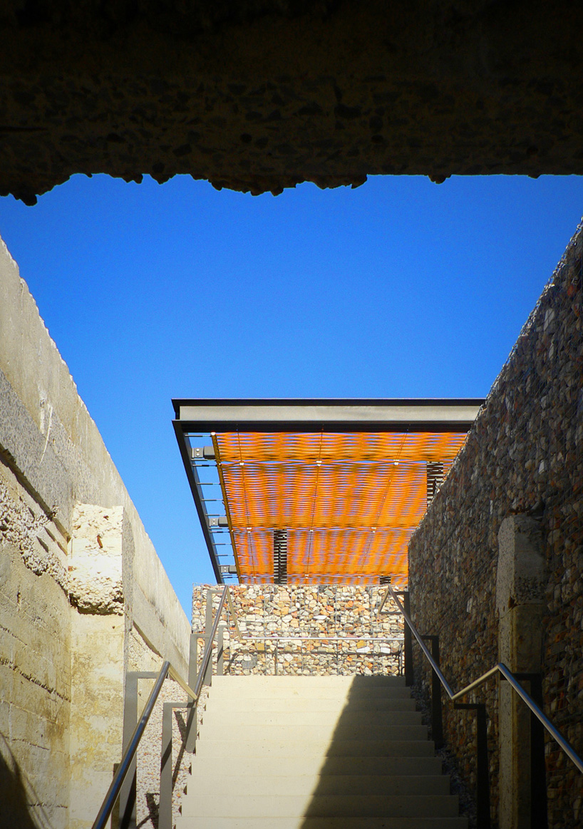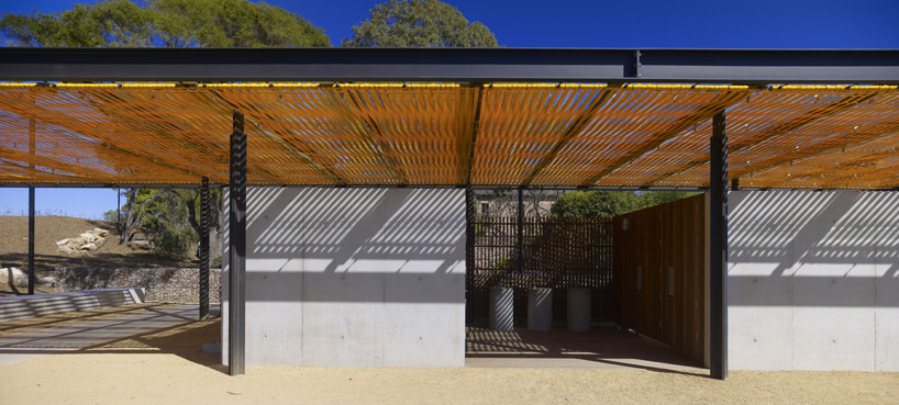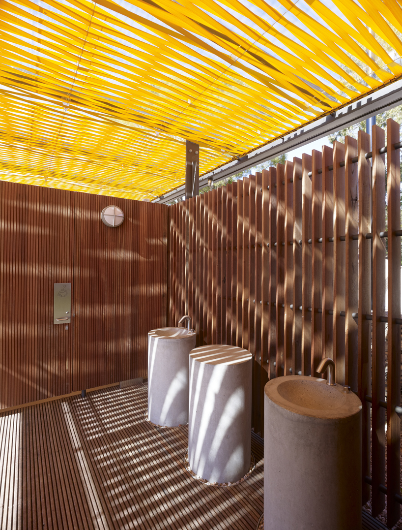 the pavilion's minimal steel framing responds to the area's industrial aesthetic while leaving a framework for the shading elements. bright yellow seat belt webbing is woven around metal rods creating a delicate pattern in the roof plane. the sun's rays are filtered through the strips producing a dappled lighting effect on the ground. this effect is complimented by thin vertical hardwood slats which clad the entrances to the public restrooms. low profile walls lead visitors towards a stairway which transitions down the steep rock face and towards the waterfront.