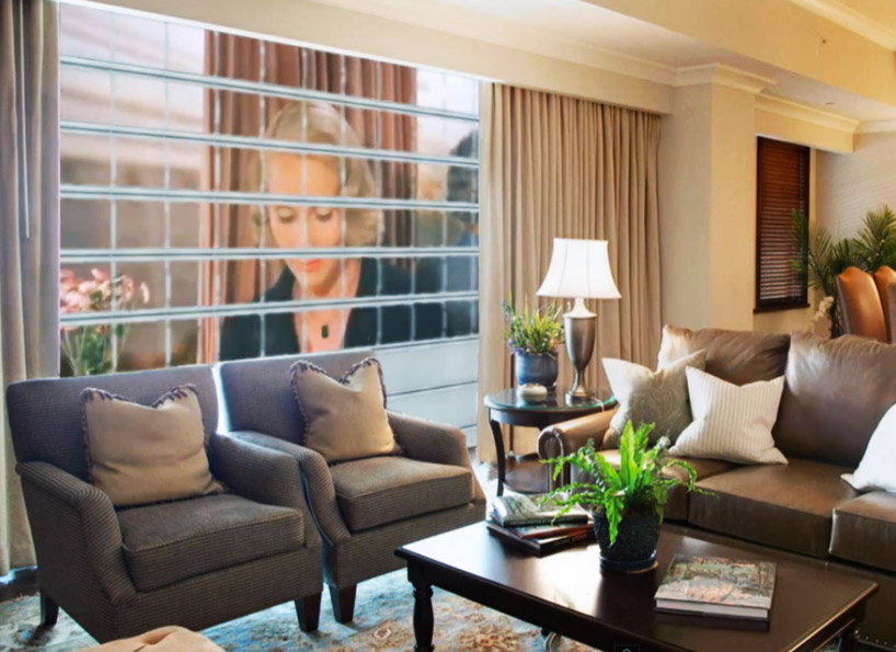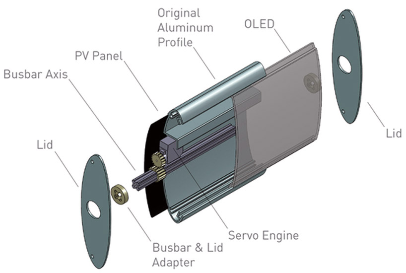 in a programmable interface that marzan hopes one day may be intuitively controlled via touchscreen,an electric motor permits each panel to be rotated on its axis so that the solar cell may be turned outwards and at specific angles during the day to harvest energy and/or permit the entry of natural light. by night, the OLED screens can be used indoors for lighting, faced outdoors to create building-scale display patterns, or utilized as a single collective screen for media playback.