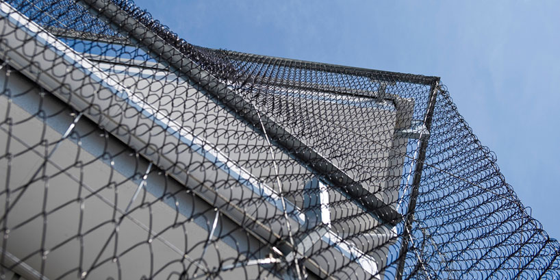 wrapped in a continuous plane of chain links, the exterior of the two-storey factory