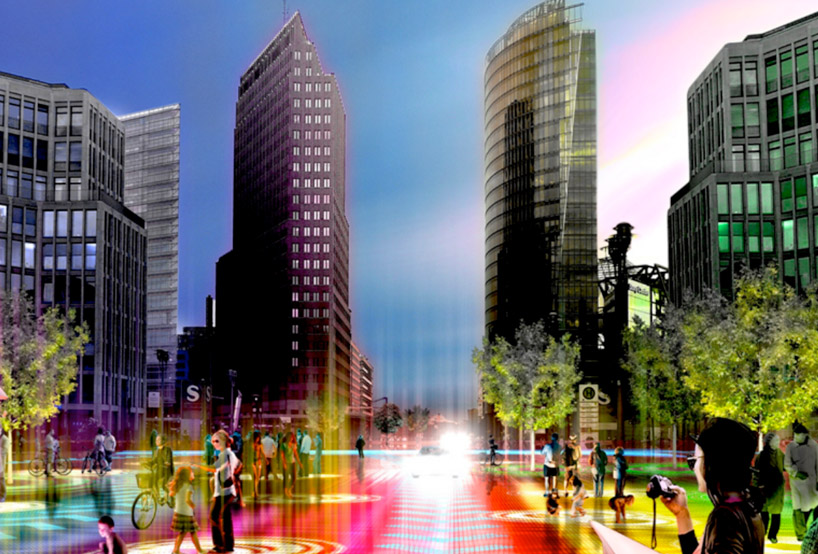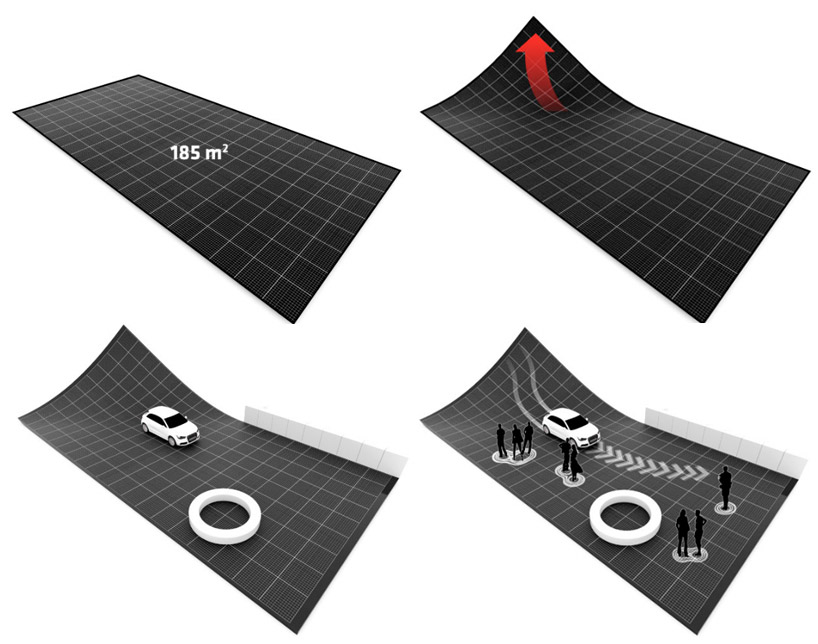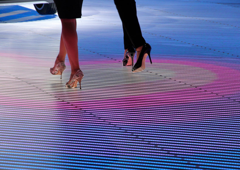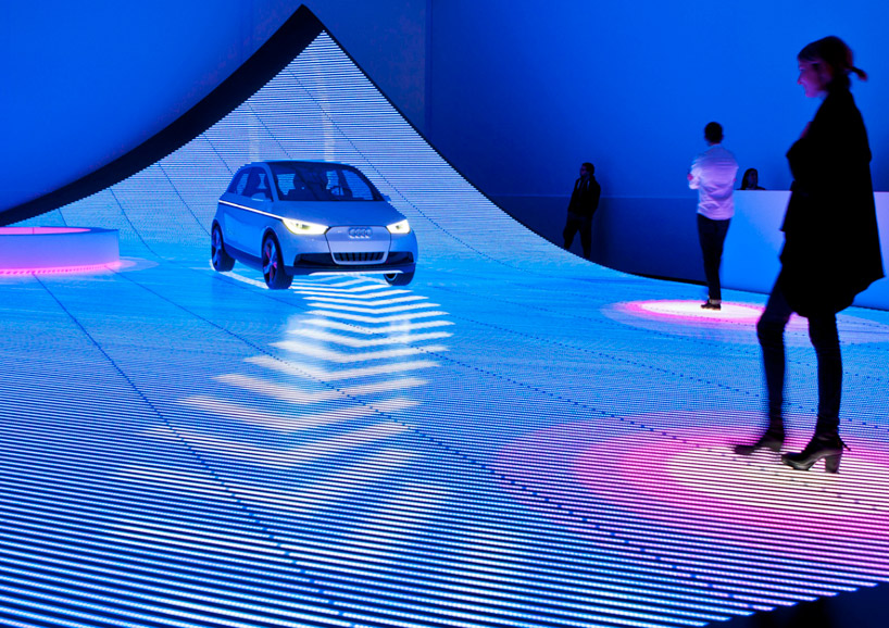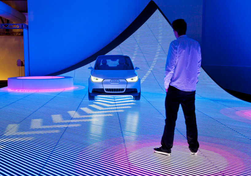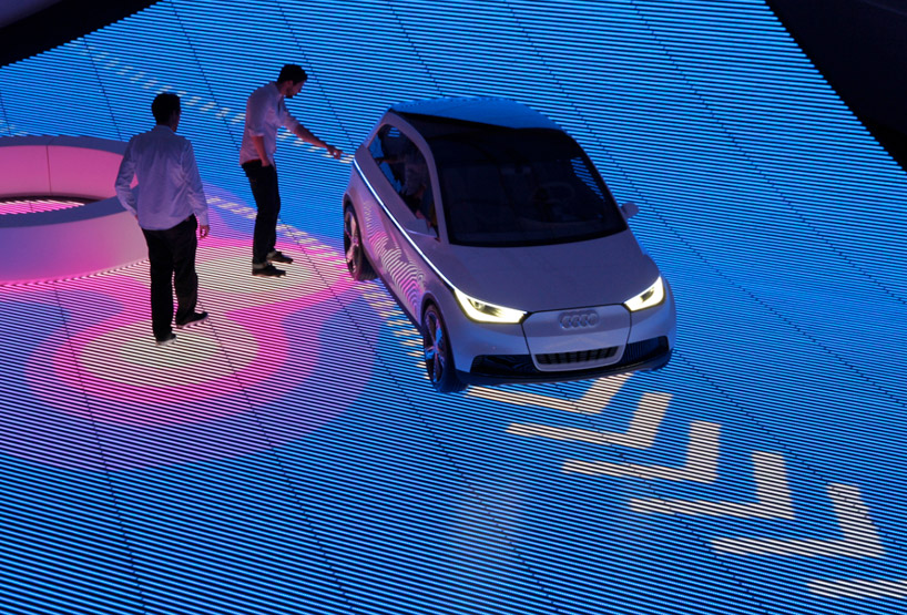denmark-based BIG architects and kollision + schmidhuber & partner teamed up to showcase the possibilities of future urban mobility for AUDI at design miami 2011. the pavillion introduced a city paved with a digital interactive surface, liberating the streets from existing pedestrian and vehicular boundaries and allowing for flexibility in public spaces. the entire area was infused with a continuous flow of information, allowing for real-time interaction between the cars and the people on foot. the 185 square meter (1991 square feet) LED installation had 3D cameras which tracked the movement of passers-by. this data was processed and generated into artwork which was fed back to the panels, following the moving visitors with colorful pockets. the AUDI A2 driverless concept car was featured as the centrepiece of urban surface prototype, continuously emitting arrows to indicate its future path as it navigated between the visitors.