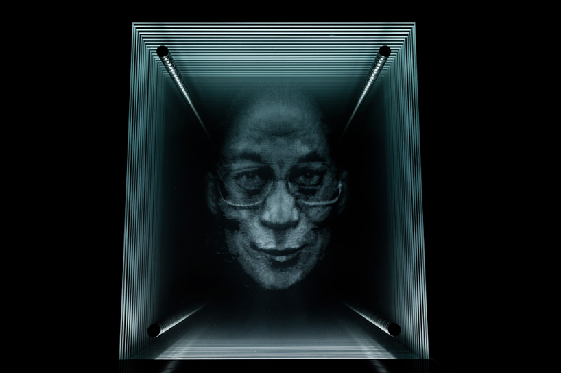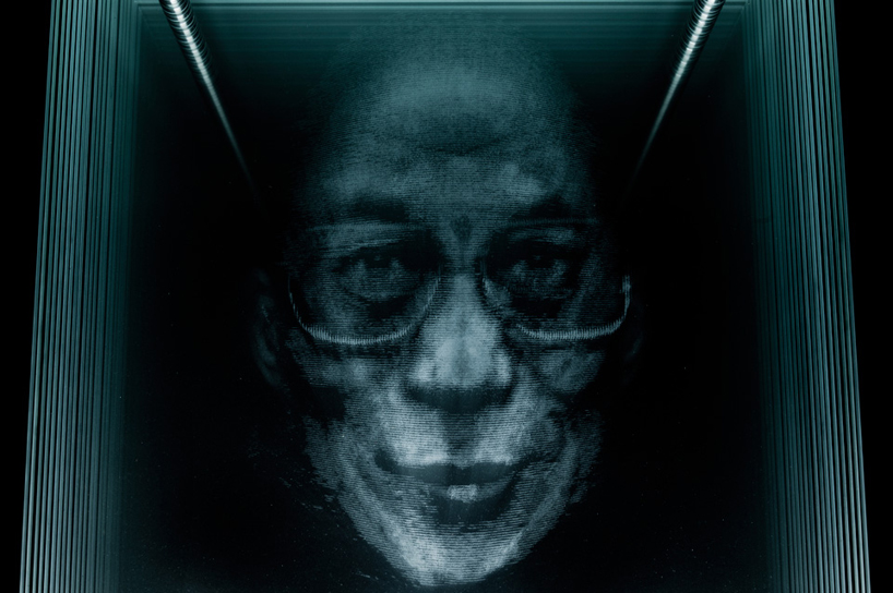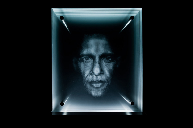 and contained in a walnut base. the faces featured in each work are hand drawn by kalyan, then etched into glass by laser. see our designboom coverage of NFN kalyan's initial work from the series 'nature of the beast', lebron.
