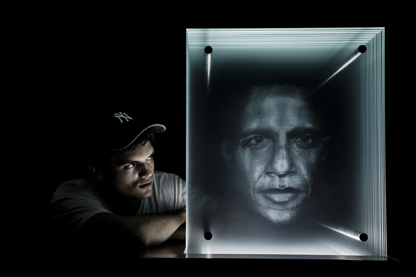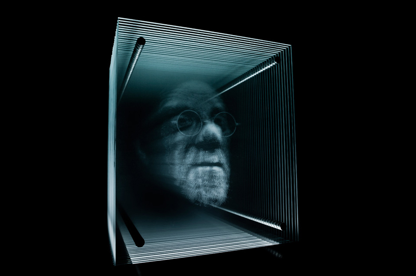 صفحه هایی شفاف که در سطحشون الگویی ایجاد کرده، و ترکیب اون ها در عمق تشکیل یک چهرهی معنادار رو می ده. این طوری با چرخش پیرامون ش هم حجمی رو در بین صفحات تصور می کنین. شبیه تصاویر هولوگرافیک