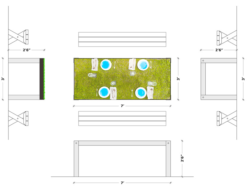 'picNYC' is made from lightweight aluminum frame which holds the grass, soil, and stones and maintains its shape by the hand trimming of the grass its owner. the dining experience of the individual is influenced by the nature of the piece- the spilling of water becomes necessity from what is typically an accident. due to the lively quality to the piece, the form, and color of the 'picNYC' is shaped by the environment in which the table exists.