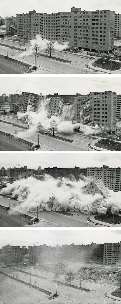 بسیاری از بلوکهای مسکونی نواری(که روزگاری رویای لوکوربوزیه بود) به عمد در پروئیت ایگو، سن لوییس و خیلی شهرهای دیگر در اروپا و امریکا منفجر شدند. با شروع نیمهی دوم دهه هفتاد، این انفجارها شکل کاملا معمول در برخورد با شکست روشهای ساختمانسازی مدرن شدند. شاید در نگاهی سطحی بتوان گفت قطعات پیشساخته، فقدان حریمهای شخصی و مجتمع مسکونی بیگانه با انسان زمینه مرگ معماری مدرن را فراهم کردند. اما حقیقت این است که در ساخت مجتمعهایی نظیر پروئیت ایگو نگاه حداقلی و ناقص به موضوع سکونت قلب چالش را پدید آورده بود.