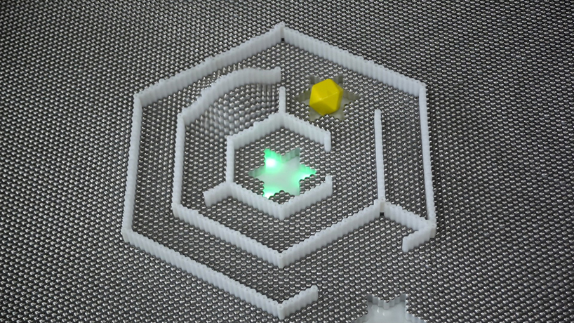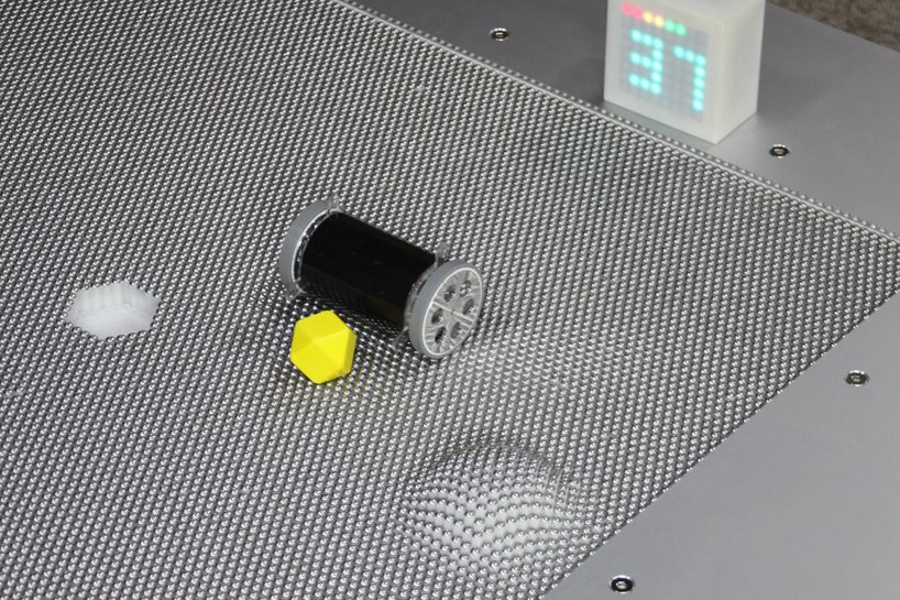 such goals were met effectively with the implementation of a new shape display combining a two-dimensionally translating mole cam with more than 15,000 close-packed hexagonal pins and cam followers, as well as a layer of spandex between the mole cam and the pins to reduce friction. the 'molebot' can interact with physical objects in two different ways. it can either push around any object via the kinetic energy from the mole cam, or pull in ferromagnetic objects with a neodymium magnet inside the cam. the 'molebot' is intended to be an oui-based game platform, rather than a general shape display. thus, people can build a small world, similar to that of a game board, on top of the table by replacing hexagonal pins with different types of small props or any other personal belongings, and enjoy playful physical interactions between the 'molebot' and real-world objects through the use of a joystick.