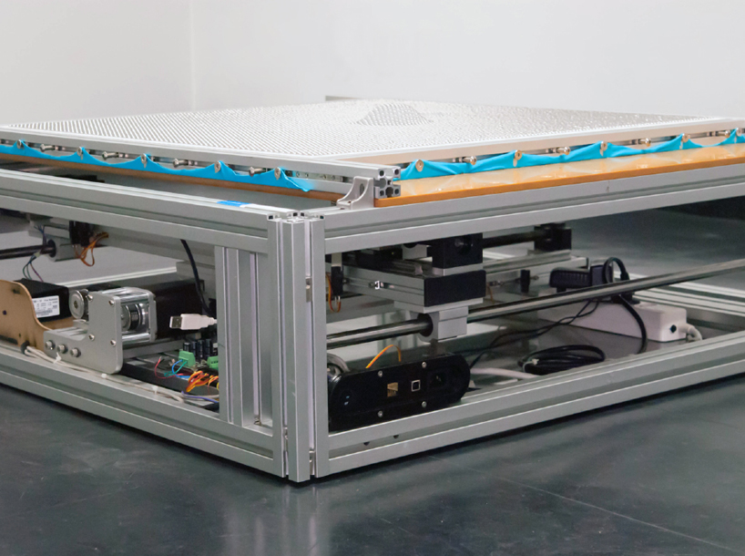 all images courtesy of design media lab'molebot', a robotic creature based on an organic user interface (oui), develop by koren company design media lab. the product was recently on show at laval virtual the european event for virtual reality & converging technology held in france. the object lives in a coffee table and interacts with small items placed on top of the surface. to ensure fluid motions of the molehills cast by the 'molebot', the table combines horizontal rigidity with the vertical flexibility of movable pins. users are enabled to interact kinetically with this creature by using a joystick or gestural commands via kinecttm. when implementing the concept of 'a mole living inside a table', the firm used a combination of high actuation speed with greater resolution and smaller sized of physical pixels to focus on enhancing physical interactivity with objects on the horizontal space.
