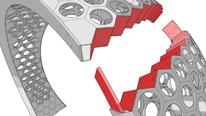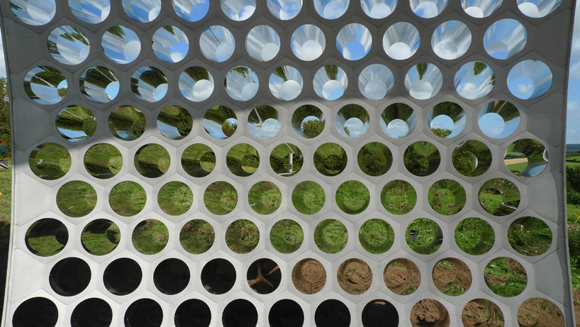 looking to the exterior from inside the honeycomb-shaped walls of the archway