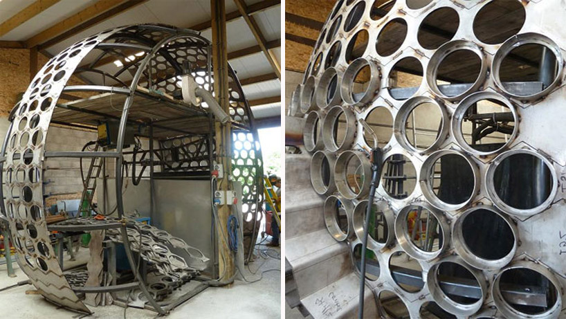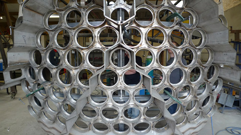 open now until the 10th of may 2012british artist luke jerram, has developed 'aeolus', an acoustic and optical wind pavilion installed in canary wharf, london, UK. the stringed musical instrument takes its name from aeolus, ruler of the four winds in greek mythology as the sculpture relies solely on the wind to create its music. the futuristic sounds produced by the massive aeolian harp are generated entirely from the 310 internally polished, stainless steel tubes and clear strings resonating with the wind. the strings are joined to exterior posts, connected to several of the pipes extruding from the arch's surface. outfitted with a skin to cover the tops of these pieces, the vibrations of the strings and skin projected down through the tubes, communicated to viewers standing beneath the arch. steel cylinders left unconnected to the strings of the instrument also add to the soundscape as they hum at lowered frequencies, responding to the external influences of wind and environmental vibration.