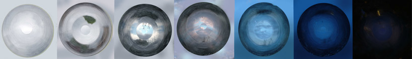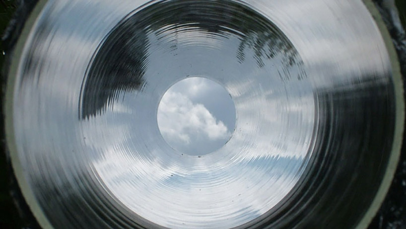 the optical aspect of the sculpture is found, firstly, in the bright, mirrored steel tubes which draw the light in through themselves an into the semi-circle below. the viewer may then be immersed in a enlarged light while looking through the tubes to the outside world, the familiar shapes and landscape both inverted and magnified. the sunlight also filters through these components, moving like an astronomical clock, indicating the time as the disks of light on the floor move as the sun moves throughout the day.