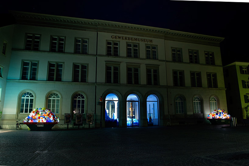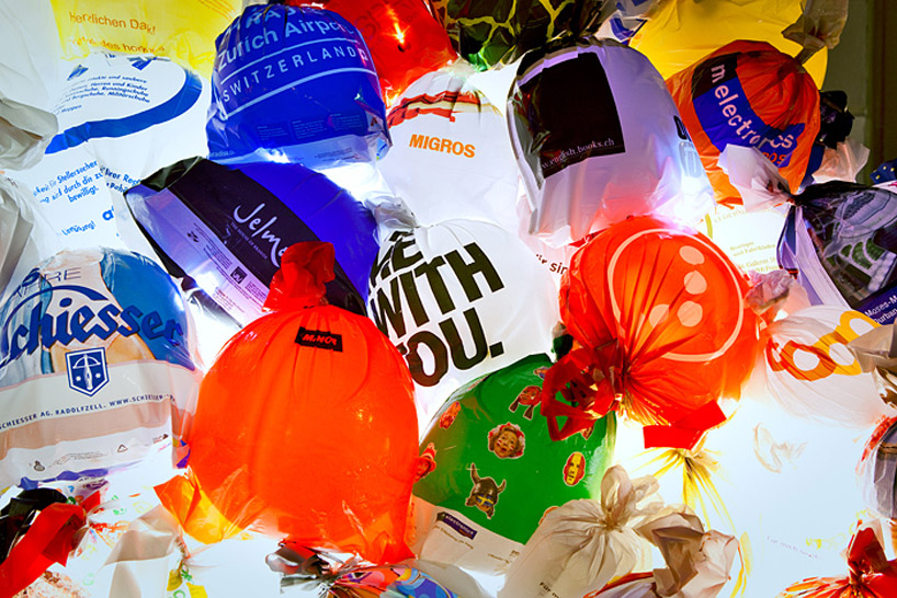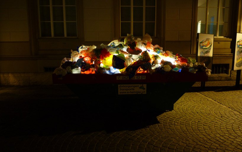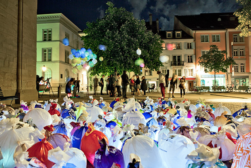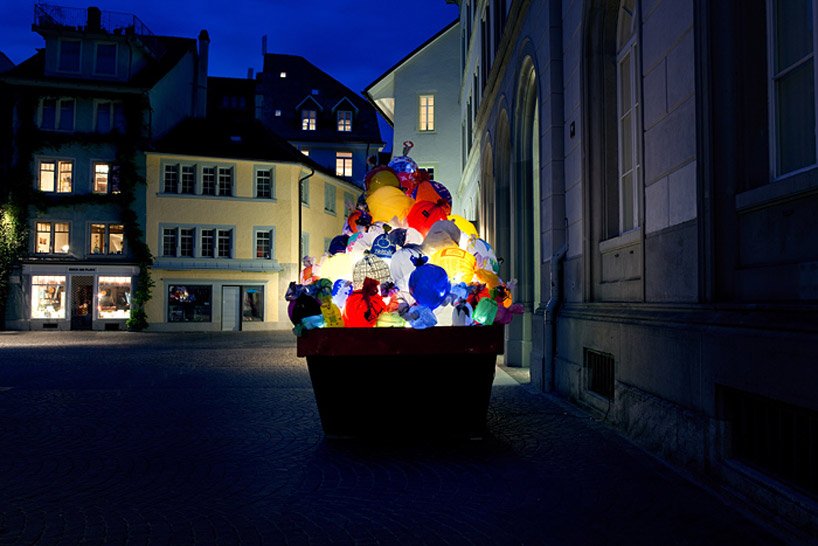in constructing the large-scale installation, luzinterruptus invited city inhabitants of the swiss town to bring disposable shopping sacs to the museum in exchange for tickets to visit the institution's various exhibitions. this initiative helped them collect more than 5,000 bags to create the colorful and illuminated work whereby they filled the bags with air - resulting in balloon forms - placed thousands within two large dumpster bins, each outfitted with a light, to form a mountain of rainbow hued plastic. each situated on either side of the museum's front door, the project is meant to bring forth discussion about consumption and the reality of plastic bags, that when not used or disposed of correctly can be very damaging to the environment. displayed over the course of four months, the work was also a documentation of the plastic bags' evolution, sitting outside to face the elements demonstrating in a visual manner the reality of this common day object.