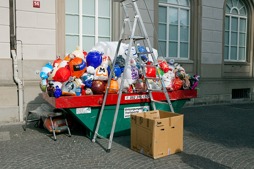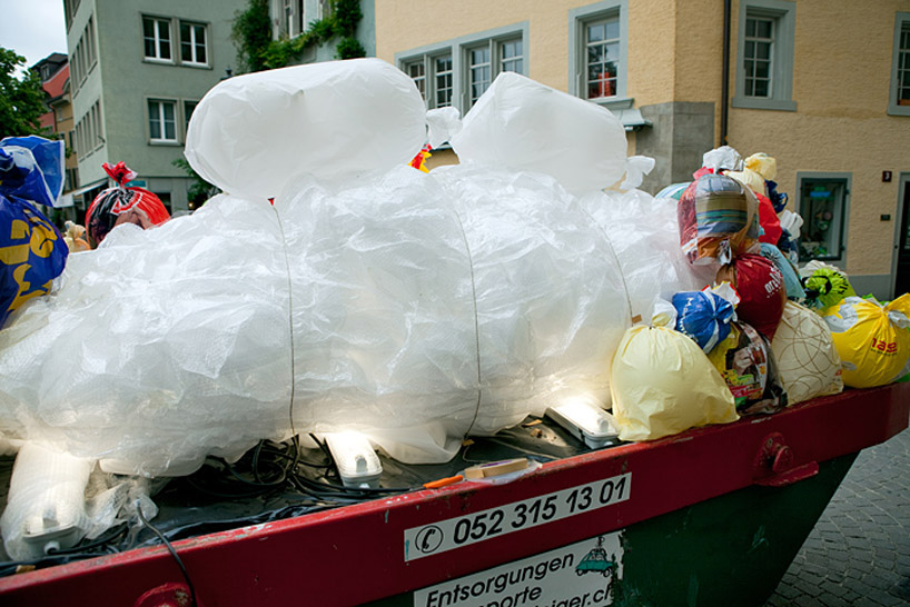 'plastic garbage guarding the museum' is the latest street intervention by spanish art collective luzinterruptus displayed as part of the 'oh, plastiksacki' exhibition at the gewerbemuseum of winthertur, a show curated by ida-marie corell and susanna kumschick revolving around the common plastic bag.