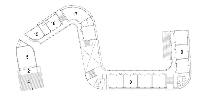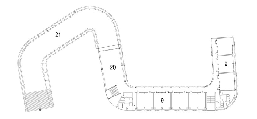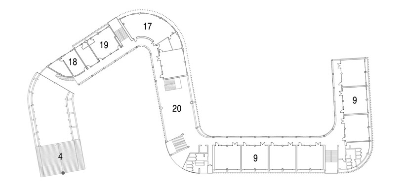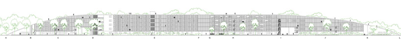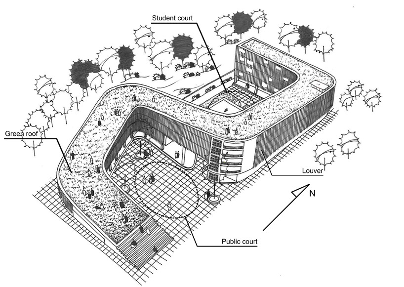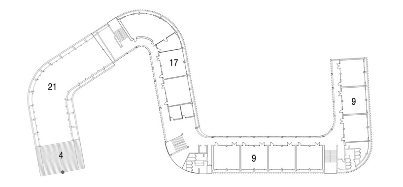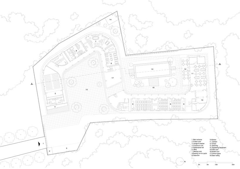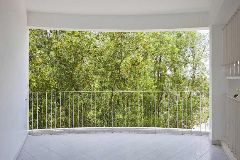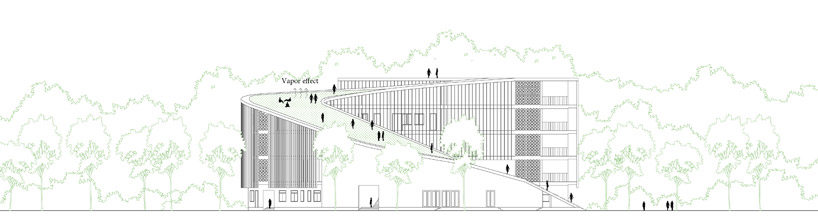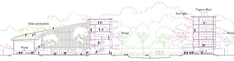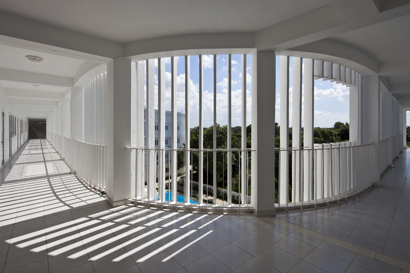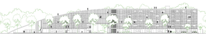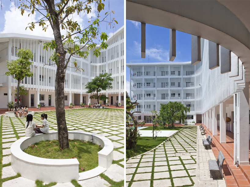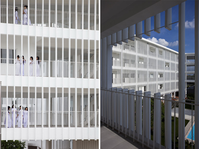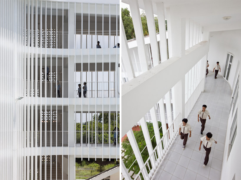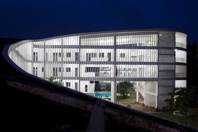 vietnamese firm vo trong nghia co has just completed the 'binh duong junior highschool' outside of ho chi minh city to house 800 students. buried within a lush forest full of fruit trees and a variety of native vegetative species, the educational institute was restricted to a height of five stories to maintain a profile below the tree tops. the swerving form gradually grows out of the ground emphasizing its connection to the site. white concrete columns and vertical louvers support the exterior corridors and passively shade the interior spaces and maintain views. the semi-permeable 'S' shape of the footprint creates two semi-protected exterior green courtyards, the first of which is used for public meeting spaces and formal events surrounded by the gym, library, laboratories and teachers' rooms. the other serves the students' classrooms, providing a private area for children to socialize around the swimming pool. the semi-transparent character of the spaces within the fluid floor plan allows for interaction between students and teachers, and provides the ability for complete privacy.