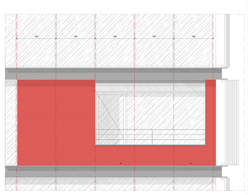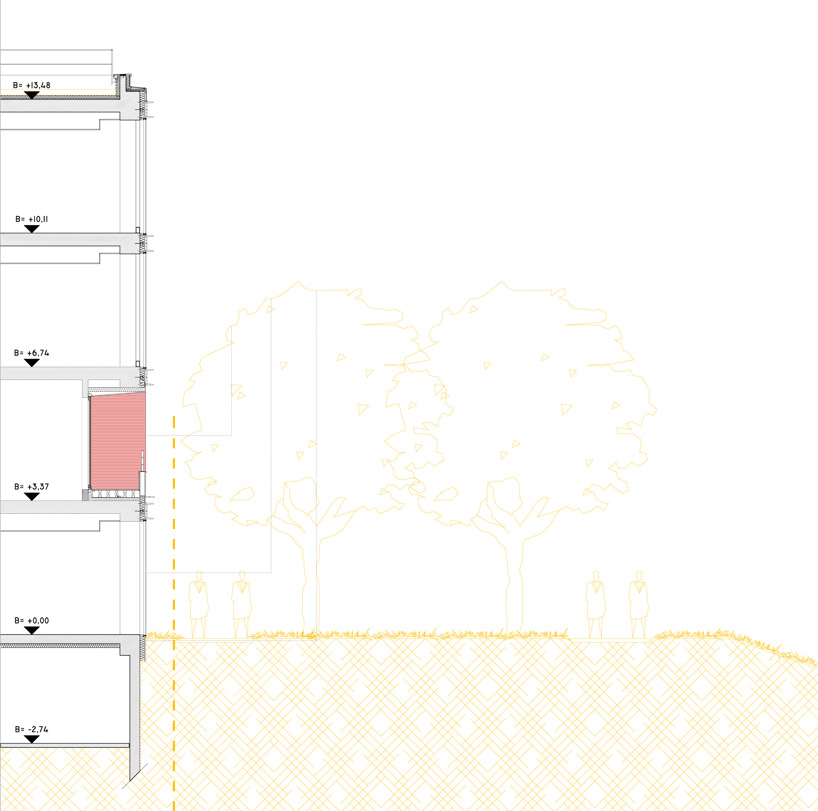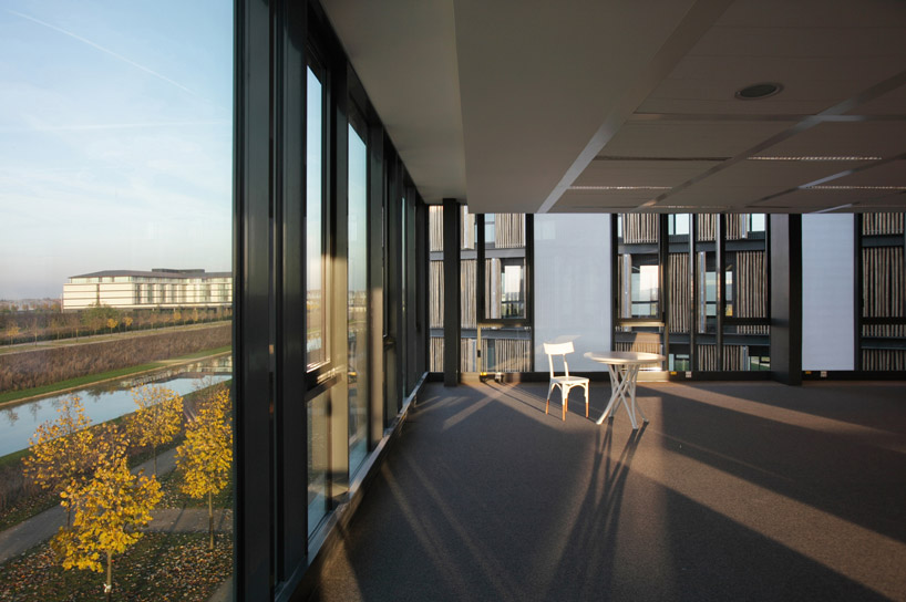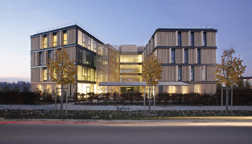 paris-based architect monica donati has completed the first block of a three-phase office complex that occupies the liminal area between city, garden and countryside. built perpendicular to the line d'eau, a tranquil canal in the lush lieusaint region, 'immeuble bambou' is remarkable in its use of repetitive building systems to seamlessly weave the architecture into the landscape. formally, the building exploits concepts of interstitial space by boldly bifurcating angled masses and then linking them with generous glazing, alternately translucent or clear. black mullions delineate onstructivist patterns across horizontal bands of windows; however, the bamboo skin is the primary method by which the architecture fractures light and form, and additionally multiplies views of the waterscape and expansive greenery. the gently twisting lines of the bamboo create a sun-shielding envelope, while at night, the durable cladding becomes a lantern. each building is equipped with distinctly colorful loggia which afford optimal views of the canal at a height rendered impossible by the existing promenade. the architectonic language looks toward the developed areas of carré sénart and simultaneously pulls nature into its atrium through visual accessibility and extraordinary cladding.