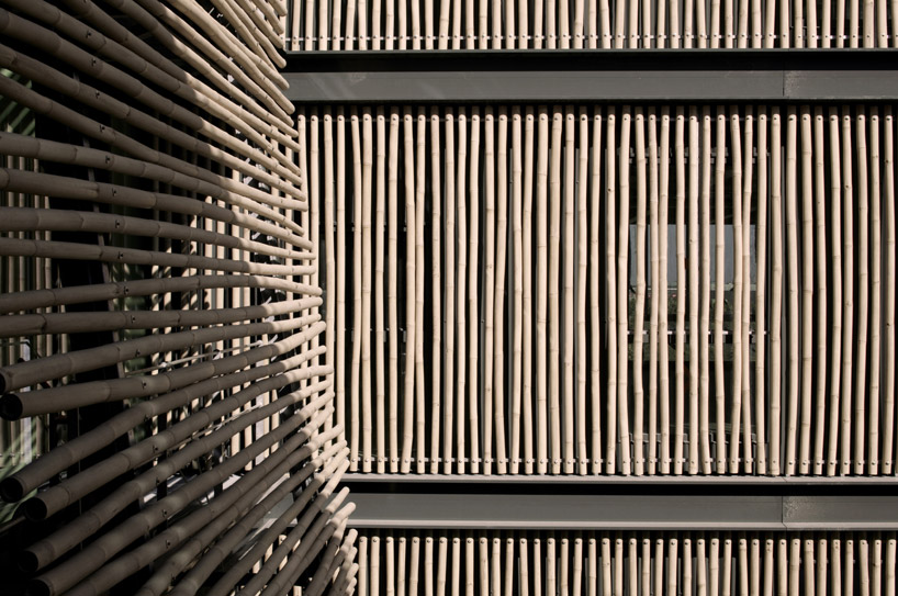 کاربرد خوب این بامبوها در نمای این ساختمون و ترکیب خوب طبیعت و صنعت الگوی خوبی برای استفاده از عناصر طبیعی در کار ساختمانیه که امروزه به کل نادیده گرفته میشه و معمولا توسط ما دورریز یا غیرقابل استفاده حساب میشن و دور ریخته میشن.