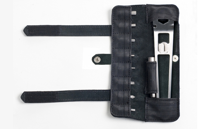 designed by london-based designer mark windsor, 'the nutter' is a new cycle specific multi-tool designed for enthusiasts everywhere. its unique design turns the steel piece into a handle, giving users more leverage in comparison to other multi-tools currently on the market. as most cyclists usually carry tyre levers or a spanner each time they go for a ride, 'the nutter' combines all components into an all-in-one tool - saving space, hassle and weight. coming in a bespoke pouch made from leather and recycled inner tubes, the case holds everything together in one small compact bundle. it is designed in such a way that it can be hung securely from the saddle rails or top tube. the 'nutter' multi-tool is currently seeking funding on kickstarter.