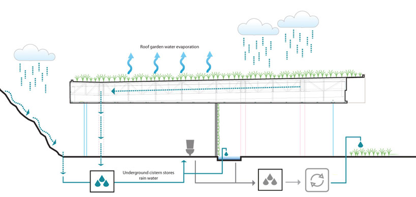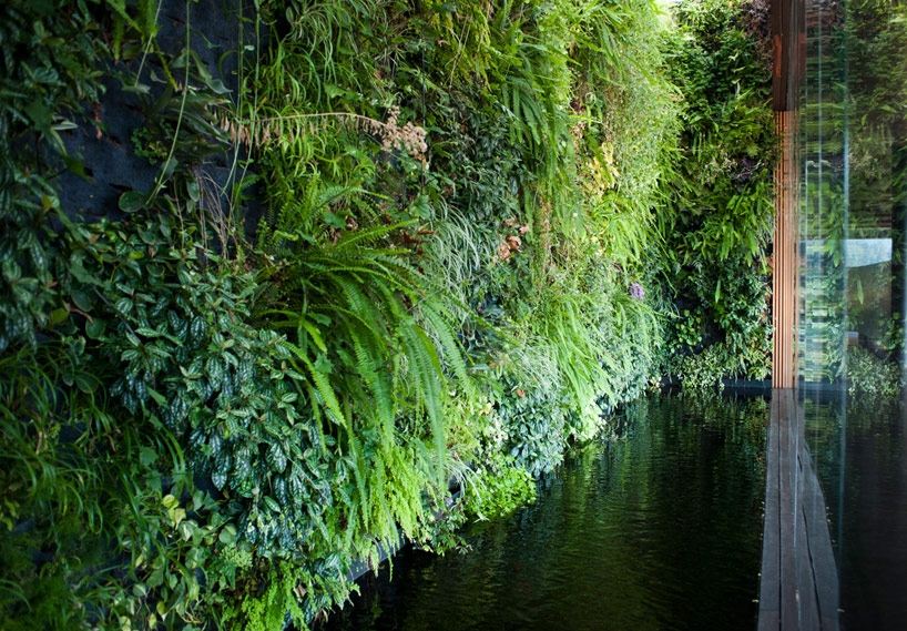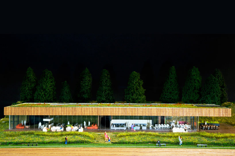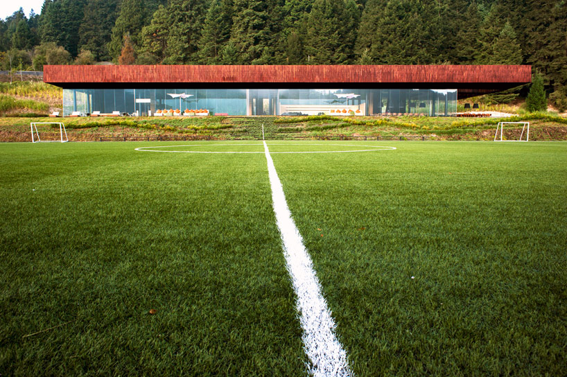 for the football fans of the world, the 'toluca house', a weekend home at the base of a mountain overlooking a soccer field is a dream come true. designed by FR-EE / fernando romero enterprise, the residence is shared amongst several families and is equipped for use as a clubhouse, offering the best in sports accommodations and private living. a large green roof structure dictates and orders the spaces below and creates a micro-ecosystem that collects and recycles rainwater. two internal open-air courtyards contain lush green walls that disappear into a reflecting pool, a dramatic