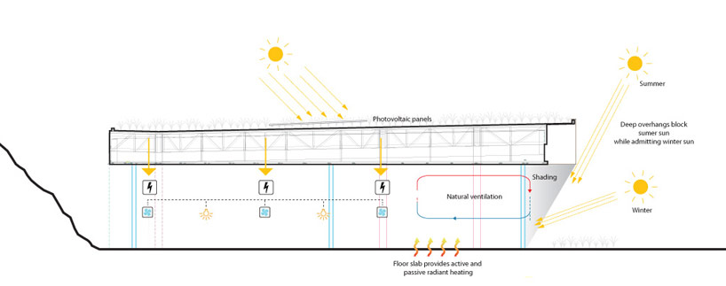 characteristics that flank the structure. a solar array on the canopy harvests renewable energy to power interior lights and fans that circulate air. large sliding glass doors naturally ventilate the house and the concrete floor slab provides active and passive radiant heating.