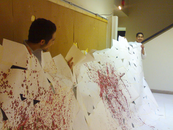 تیم اجرایی پروژه برای تامین کاغذ مورد نیاز تمام اطراف دانشکده را زیر و رو میکنند تا کاغذهای مصرفی دورریز بچههای معماری را به عنوان کاغذ مورد نیاز استفاده کنند. با این کار ارتباط اثر با مجموعهی دانشگاه نیز بیشتر شد و فستیوال خون از دل مصرف بی حساب و کتاب خود دانشجویانی که مخاطب اثر هستند شکل گرفت. الوارهای چوبی به کار رفته در فضا نیز با هماهنگیها و پیگیریهای مکرر از تکه تکه کردن اصله درختی که در یک سانحهی طبیعی در فضای سبز دانشکده از تنه شکسته بود تهیه شد. به این ترتیب به صورت کاملا سبز و با احترام کامل به طبیعت، طرح به صورت آرام آرام و در برخورد مستقیم با سایر دانشجویان دانشگاه تکمیل شد، طوری که امکان درگیری مخاطب با سیر شکل گیری و برگزاری این فستیوال فراهم گردد. همچنین با طراحی پوستری از عموم دانشجویان دعوت به عمل آمده بود تا به تماشای این فستیوال بیایند.