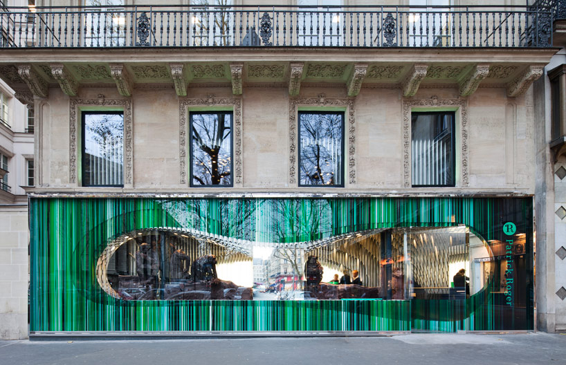این قنادی در پاریس برای بازطراحی فضای داخلی خود، انتزاع یک کندوی بزرگ با استفاده از لولههای فلزی و برشهای نظاممند از آنها به منظور دربرگرفتن فضای داخل قنادی کمک گرفته است. ویترینهای بزرگ امروز واحدهای تجاری امکان بروز ایدههایی متنوع و متهورانه در فضای کسب و کار را میدهد که از یک واحد تجاری نمایشگاهی بالقوه در بافت شهری میسازند. هرچند گاهی طراحان مانند این طرح فضایی وهمی و خلسهآور به وجود میآورند که معلوم نیست تا مدت زیادی به کسب و کار صاحب واحد تجاری کمک برساند.
