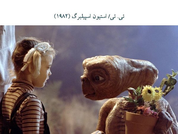 E-T . یک موجودی که نمیدانیم ناگهان از کجا آمده است و روی زمین پیدایش میشود. تعدادی بچه به آن علاقهمند میشوند. این موجود بعد از مدتی میمیرد، بعد دوباره زنده میشود. در این زمان بچهها دوباره کمکش میکنند تا به آسمان برود. معجزه هم دارد. چیزهایی را شفا میدهد. بعضی از دردها را هم برطرف میکند. این تصویر هم برای شما آشنا است. سقف نمازخانهی سیستین در واتیکان. آن تصویر به نوعی خلقت آدم را نشان میدهد و با این پوستر به نوعی آن موجود را آسمانی کردهاست.