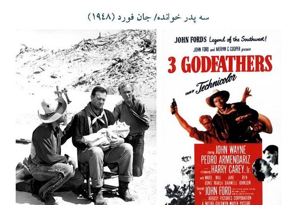 سومی آن هم این است که جان وین و دو بازیگر دیگر فراری هستند. از شهر نئوجرزالم میروند و دزدی میکنند، از آن شهر فرار میکنند و به بیرون شهر و بیابان میروند. دنبال آب میگردند. یک دلیجان میبینند که یک زنی در آن است و دارد میمیرد و شوهرش هم رفته است تا آب بیاورد. بعد آن زن بچهاش را به دنیا آوردهاست و بچهاش را به اینها میسپارد و خودش میمیرد و اینها دوباره برمیگردند به همان شهر نئوجرزالم یا همان اورشلیم جدید. وقتی که بچه را میگیرند عصر است. یکی از آنها میگوید که حالا باید از کدام طرف برویم؟ یکی جواب میدهد که ببین ستاره کدام طرف است!؟ هوا روشن است کاملا تماشاگر روز را میبیند ولی ستاره هم در تصویر هست. ارجاعات انجیلی این فیلم خیلی زیاد است. من یک بار آن را تورق میکردم به خیلی از ارجاعات برخوردم. متن PDF رمانش در اینترنت هست و میتوانید بروید و جستوجو کنید و بخوانید. نویسندهاش معروف نیست. عرض کنم خدمتتان که دو نفر از این سه نفر میمیرند و فقط یک نفر که جان وین نقشش را بازی میکند زنده میماند و وقتی به شهر نئوجرزالم میرسد، الاغی میآید و این بچه را روی الاغ میگذارد، همان الاغی که حضرت عیسی (ع) مثلا روی آن سوار شدهاست. بعد وارد آن شهر میشود و اتفاقاتی هم برایش میافتد.