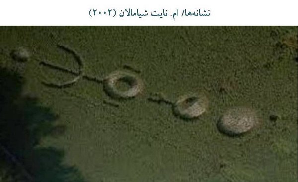 حالا من یک جمله هم دربارهی همراهی مسیحیت و یهودیت بگویم. تا الآن تقابل آنها را گفتم و از اینجا به بعد همراهی. آنها در بعضی از موارد واقعا با یکدیگر همراهی دارند و آن هم ضدیت با اسلام است. فیلمی در سال 2002 ساخته شد به نام Signs یعنی نشانهها. کارگردان هندیای که فیلم حس ششم را ساخت، این فیلم را ساخته است. در این فیلم مل گیبسون یک کشیشی است که به تازگی از قامت کشیشی استعفا دادهاست و دیگر لباسهایش را نمیپوشد. مثل آخوندهایی که میگویند که من دیگر نمیخواهم آخوند باشم! او این کار را کرده است ولی اتفاقی میافتد که او دوباره باز میگردد به همان قامت کشیشی و لباس کشیشان را میپوشد. آن اتفاق این است که او در خانهاش که یک مزرعهی بزرگ ذرت، آن را دربرگرفتهاست، در انتهای مزرعه میبیند که موجوداتی ماورایی آمدهاند و نشانههایی را روی زمین گذاشتهاند که از فضا به این صورت که در تصویر میبینید دیده میشود. در حین داستان فیلم اتفاقاتی میافتد و آنها یکی از این موجودات را میگیرند و میکشند و ... که قصهاش مفصل است. این اتفاقات باعث میشود که این فرد دوباره ایمان بیاورد و شک و تردیدی که داشتهاست دوباره درست شود. در فیلم گفته میشود که این نشانهها برای اولین بار در خاورمیانه دیده شدهاست. این نشانهها برای اولین بار در خاورمیانه دیدهشده است یعنی چه؟ به نظر شما این حرف به دین اسلام اشاره دارد؟ تصویر این نشانه را من از اینترنت برداشتم. تصویر این نشانه را 180 درجه بچرخانید و ببینید که چه چیزی دیده میشود. ببینید آیا میتوایند کلمهای را بخوانید؟ "محمد"