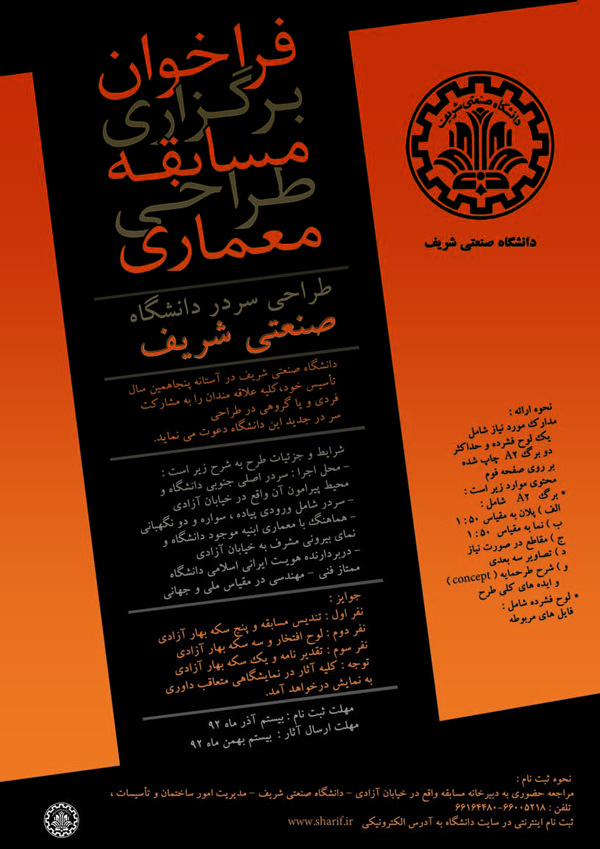 در وبسایت دانشگاه صنعتی شریف اعلام یک مسابقه خوب با ابعادی مناسب دانشجویان و طراحان جوان شدهاست که حیفم آمد در یانوندیزاین هم دیده نشود. دانشگاه صنعتی شریف در آستانه پنجاهمین سال تأسیس خود، کلیه علاقهمندان را به مشارکت فردی و یا گروهی در طراحی سردر جدید این دانشگاه دعوت مینماید.