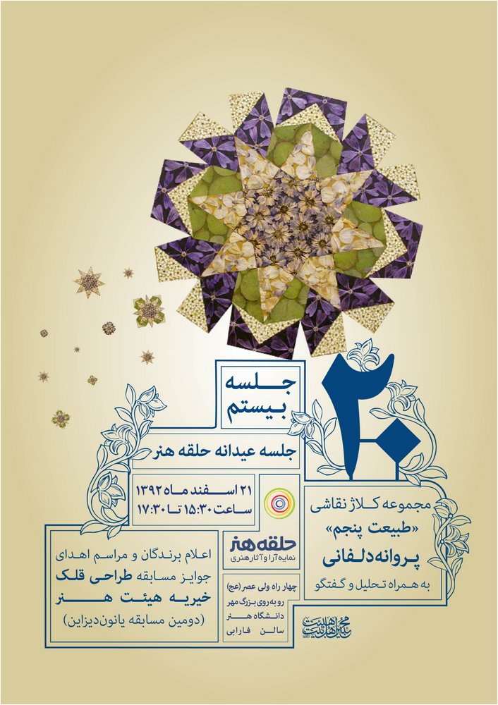 جلسه بیستم حلقه هنر چهارشنبه بیست و یکم اسفندماه ۹۲، به نمایش و تحلیل و گفتگوی پیرامون کلاژ-نقاشیهای بهارانه پرورانه دلفانی میپردازد. این کلاژها از برگ گلهای رنگانگی تشکیل شدهاند که هنرمند در ظرافتی بینظیر آنها را در ترکیببندیهایی هندسی کنار هم قرار داده است. در حاشیه حلقه هنر بیستم مراسم اهدای جوایز و اعلام نتایج دومین مسابقه طراحی وبسایت یانوندیزاین یعنی طراحی قلک خیریه هیئت هنر برگزار خواهد شد..