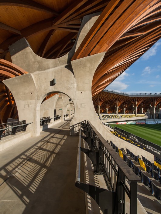 با وجود آنکه عظمت سازههای دوران معاصر استفاده از مصالح طبیعی و یا بومآورد را محدود کرده است اما هنوز هم میتوان در ساخت سازههای وسیع به فکر استفاده از مصالح طبیعی بود. استادیوم پانچو که توسعه یک بافت قدیمی فوتبالی در کشور مجارستان است با استفاده از سازههای عظیم خوش فرمی از ترکیب بتن مسلح و چوبهای فرمدادهشده, پوشانده شدهاست. طراحان بنا تاماس روبروسی و معماران دوپاروم با استفاده از این مصالح طبیعی توانستهاند از یک سازه غول پیکر فراانسانی یک سازه دوستداشتنی و فضایی ملموس و انسانی بسازند؛ درست مانند معماری گوتیک اروپا.