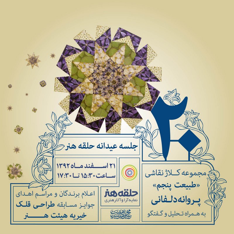 جلسه بیستم حلقه هنر چهارشنبه بیست و یکم اسفند‌ماه ۹۲، به نمایش و تحلیل و گفت‌گوی پیرامون کلاژ-نقاشی‌های بهارانه پرورانه دلفانی می‌پردازد. این کلاژ‌ها از برگ گل‌های رنگانگی تشکیل شده‌اند که هنرمند در ظرافتی بی‌نظیر آن‌ها را در ترکیب‌بندی‌هایی هندسی کنار هم قرار داده است. در حاشیه حلقه هنر بیستم مراسم اهدای جوایز و اعلام نتایج دومین مسابقه طراحی وب‌سایت یانون‌دیزاین یعنی طراحی قلک خیریه هیئت هنر برگزار خواهد شد..