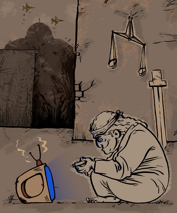 حسین یوزباشی تصویرگر و گرافیست جوان، در کاریکاتورهایی مستقل، این صلح کاسبکار را که در وقایع اینروزهای فلسطین عزیز بیش از هر زمان به چشم میآید به تصویر کشیده است. صلحی که با تبلیغات وسیع چونان مشغول بازیهای جام جهانی می شود که از تکه تکه شدن بدنها و ویران شدن خانهها -عامدانه- غافل میماند. صلح کاسبکار کثیف....
